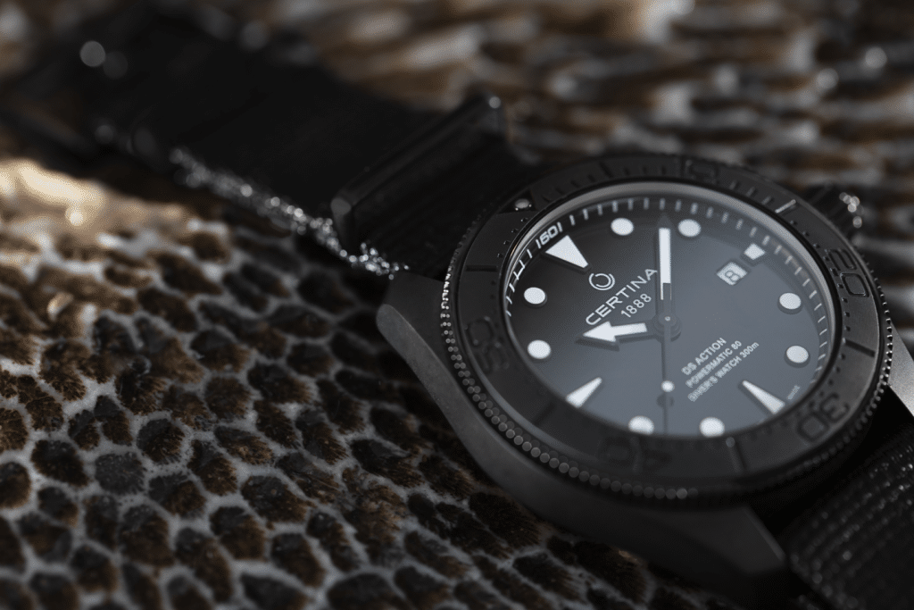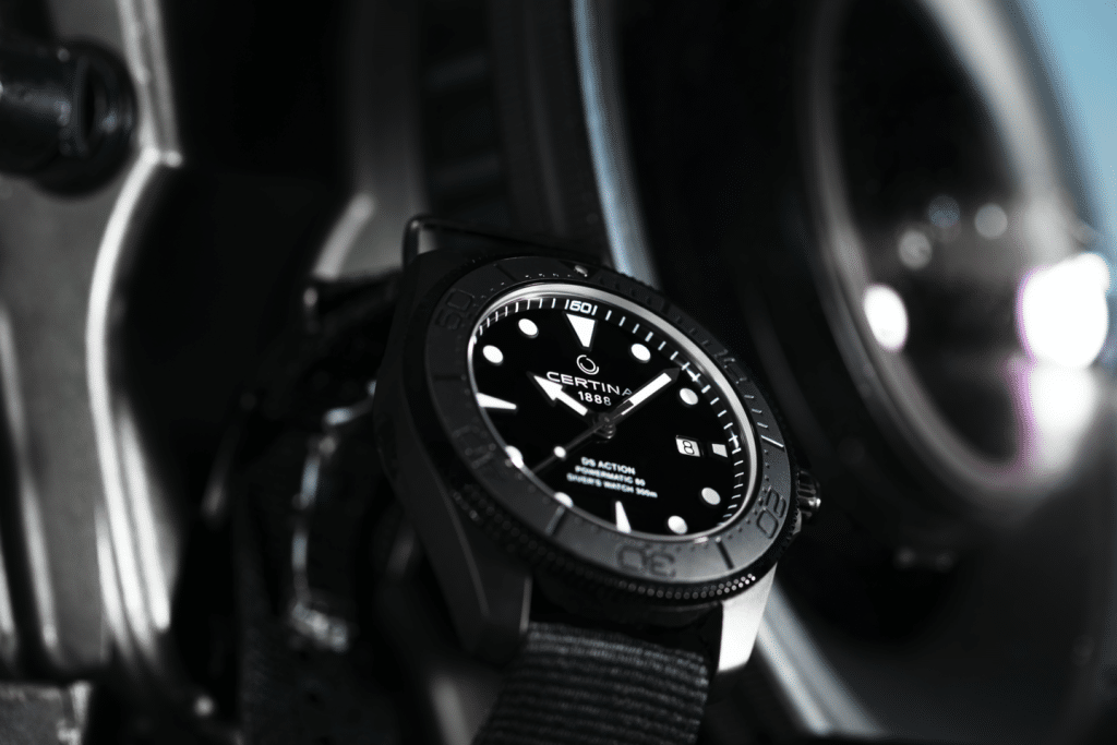 Den helsvarte DS Action Diver er utformet med fokus på detaljer og symboliserer Certinas dedikasjon til presisjon og stil.