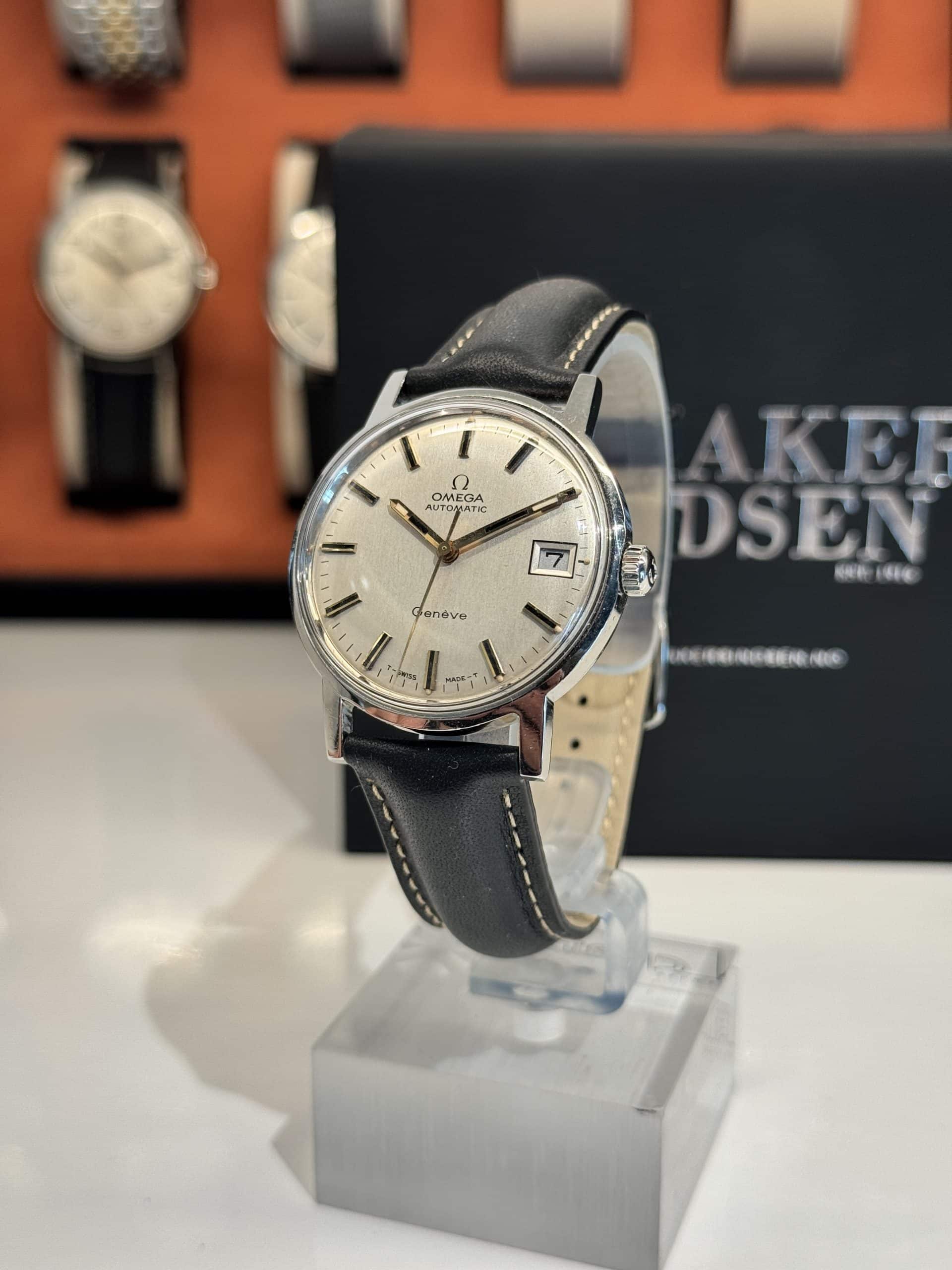 Omega Vintage i stål med sort skinnrem. klokken er nyservet. Klokken har en tilnærmet strøken tallskive og er fra 1972.