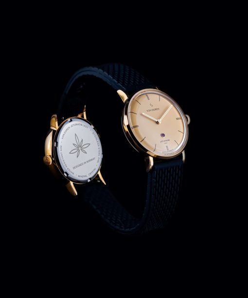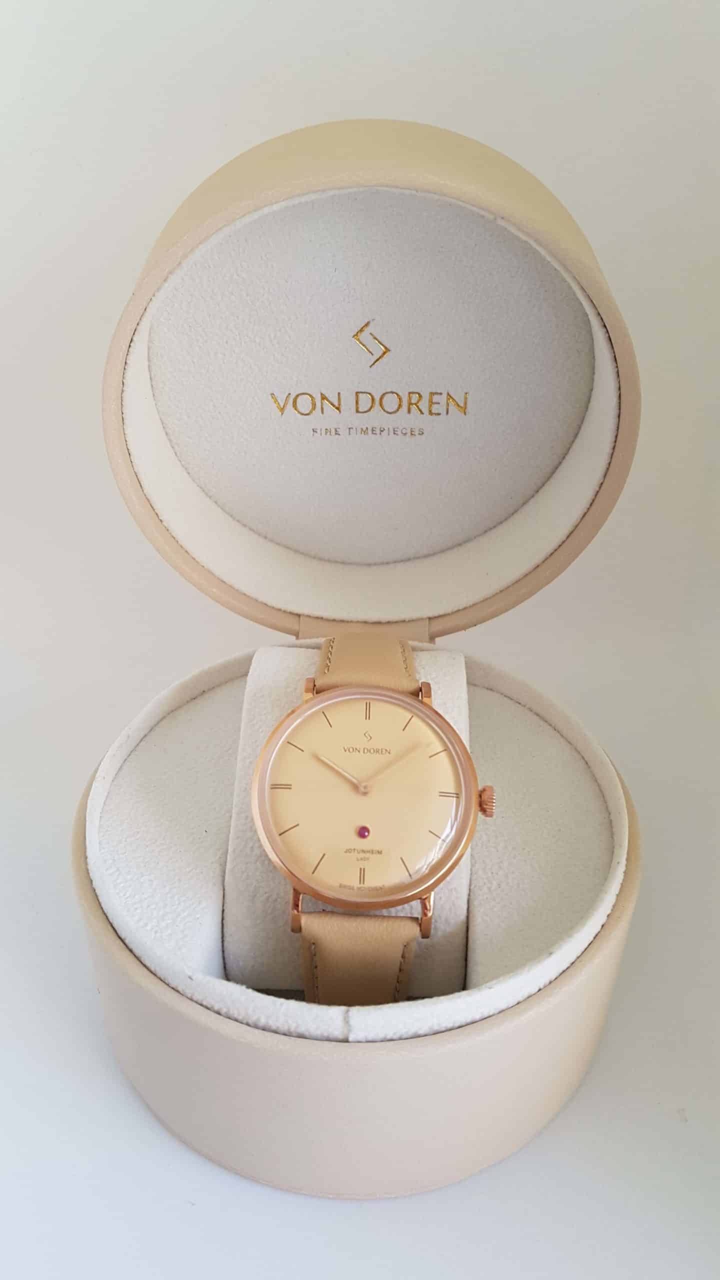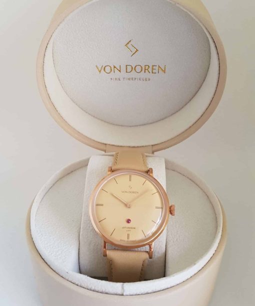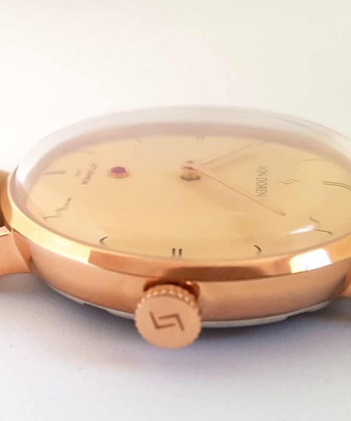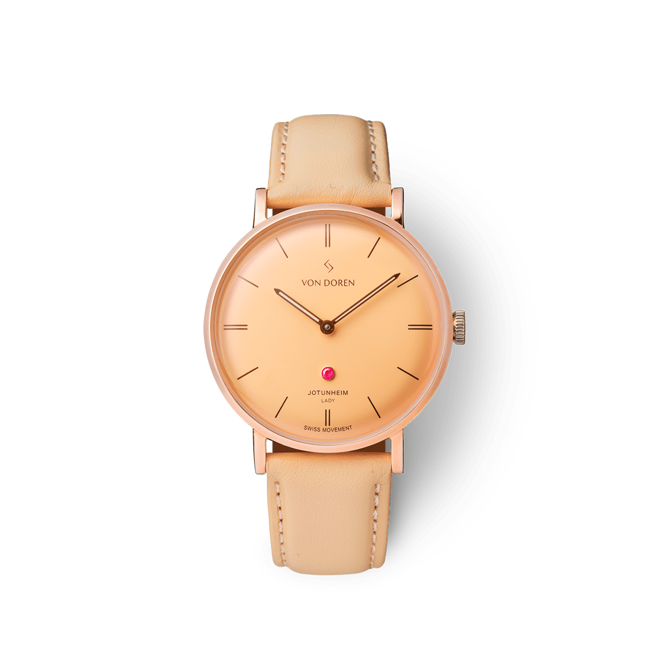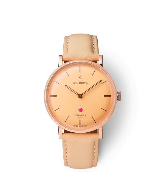 En unik versjon i Jotunheim Lady serien. Denne modellen med Champagnefarget skive og rosegull urkasse vil garantert bli møtt med beundrende blikk. En ekte Grade A rubin på urskiven er prikken over i en. Dobbelthvelvet safirglass og sveitsisk urverk gjør dette til en klokke utenom det vanlige. Leveres med en myk og god beige italiensk skinnreim med “ quick release”-system, slik at du lett skifter reim for å matche ethvert antrekk.